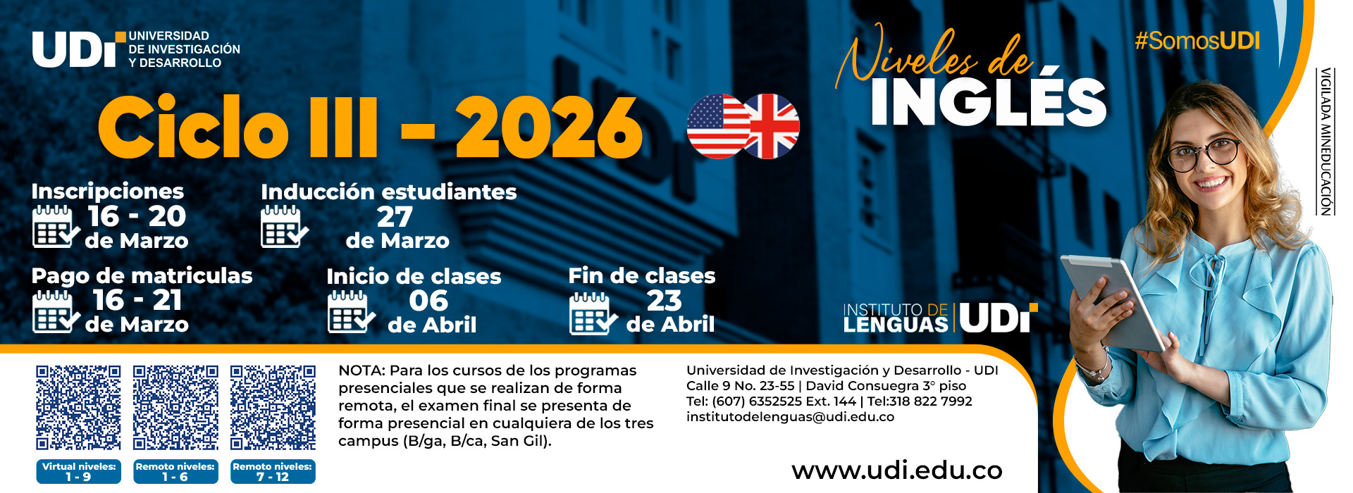 La Universidad de Investigación y Desarrollo UDI es una universidad en Bucaramanga, Santander, con programas profesionales de pregrado, posgrado y programas virtuales en áreas como ingeniería de sistemas, ingeniería electrónica, ingeniería industrial y psicología.
